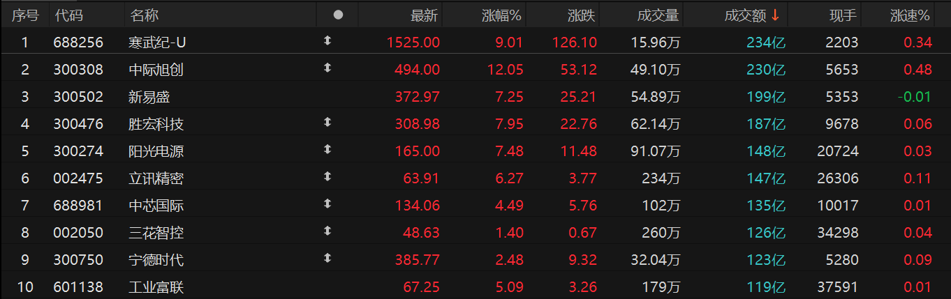 个股方面,寒武纪-U234亿元居首,中际旭创、新易盛、胜宏科技成交额靠前。