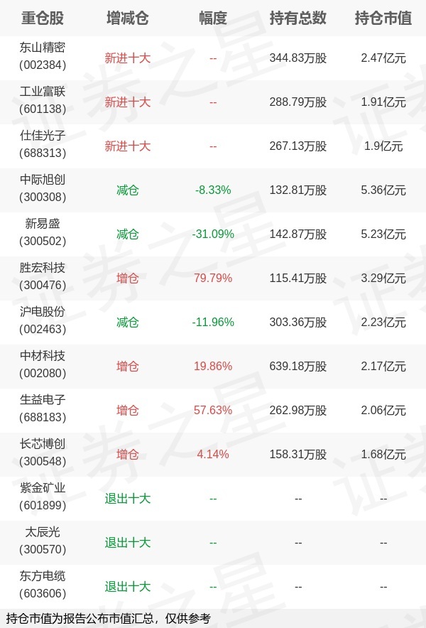 证券之星消息,10月28日华商基金旗下张明昕管理的华商优势行业灵活配置混合型基金公布三季报,近1年净值增长率88.5%。与上一季度相比,该基金前十大重仓股新增东山精密,工业富联,仕佳光子;其中中际旭创持仓占比9.07%,为该基金第一大重仓股;紫金矿业,太辰光,东方电缆等退出前十大重仓股;详细数据如下: